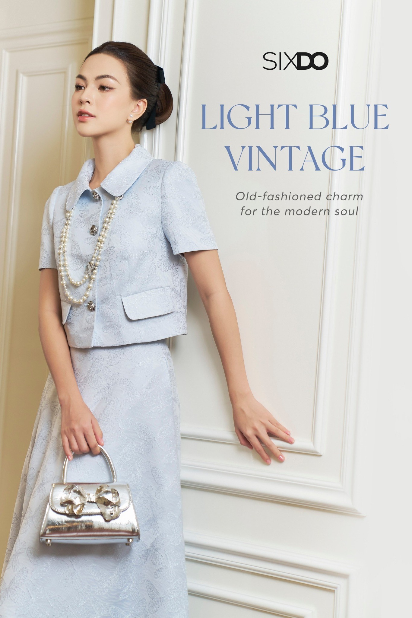 Đặc biệt, vải gấm tơ mùa này SIXDO sử dụng chất mỏng nhẹ hơn và dệt nổi hoa văn hồ điệp bay bổng, lãng mạn. Dung hòa mọi yếu tố và nàng như đang sống trong những giây phút thăng hoa, tròn vành cùng với phong cách vintage.