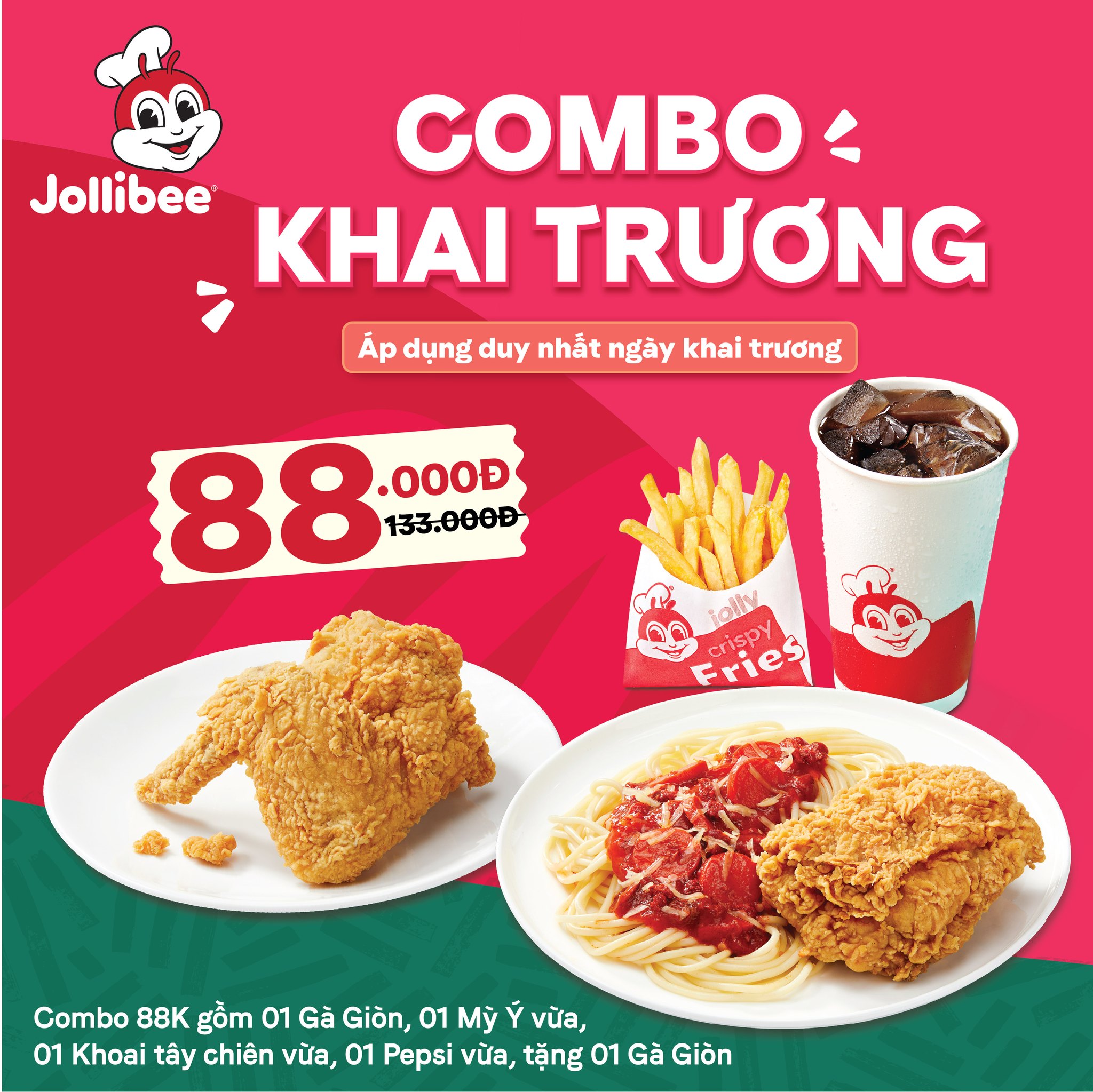 🍗 Combo 88K: 1 Gà Giòn + 1 Mỳ Ý vừa + 1 Khoai tây chiên vừa + 1 Pepsi vừa Tặng thêm 1 Gà Giòn, áp dụng duy nhất ngày đầu khai trương