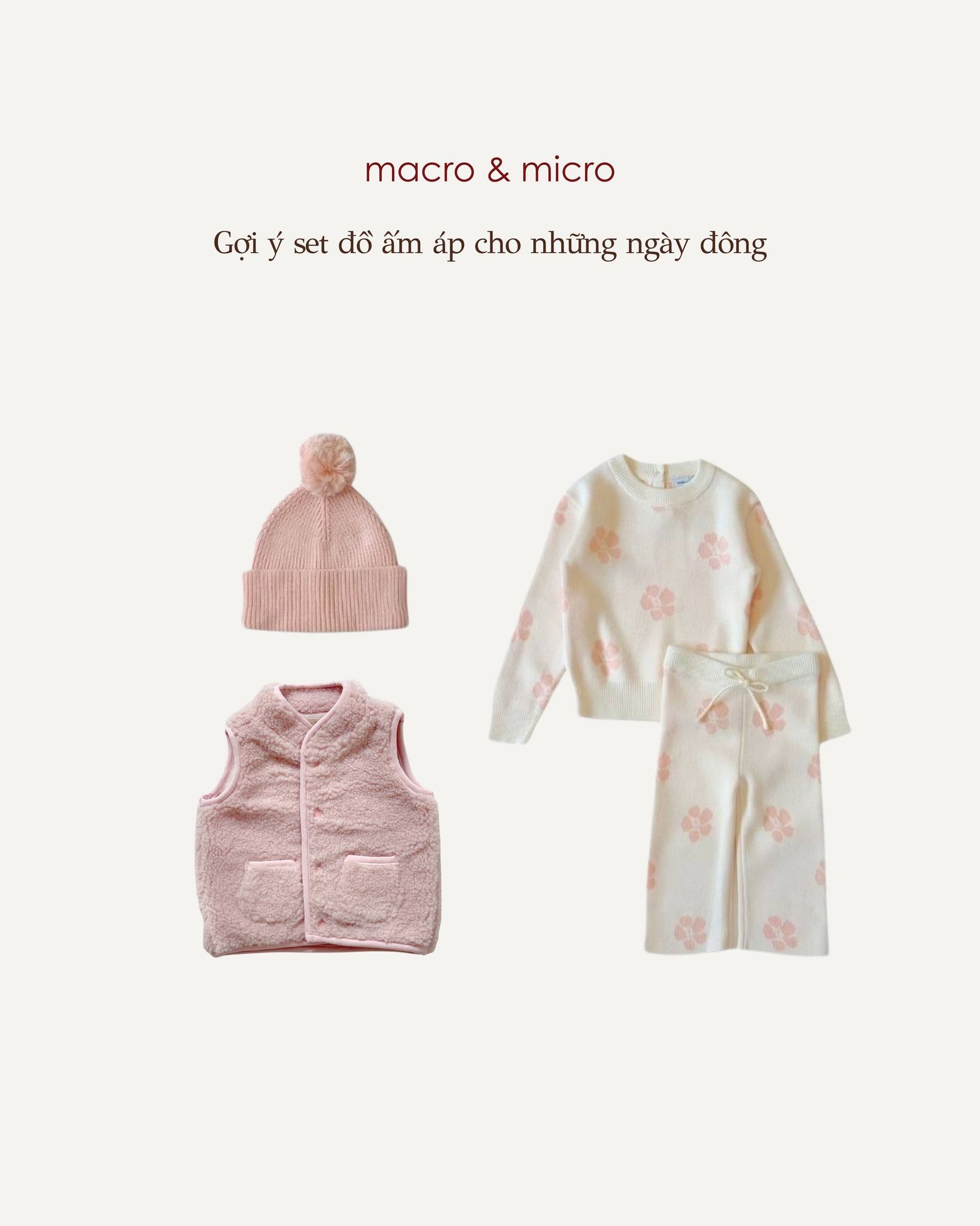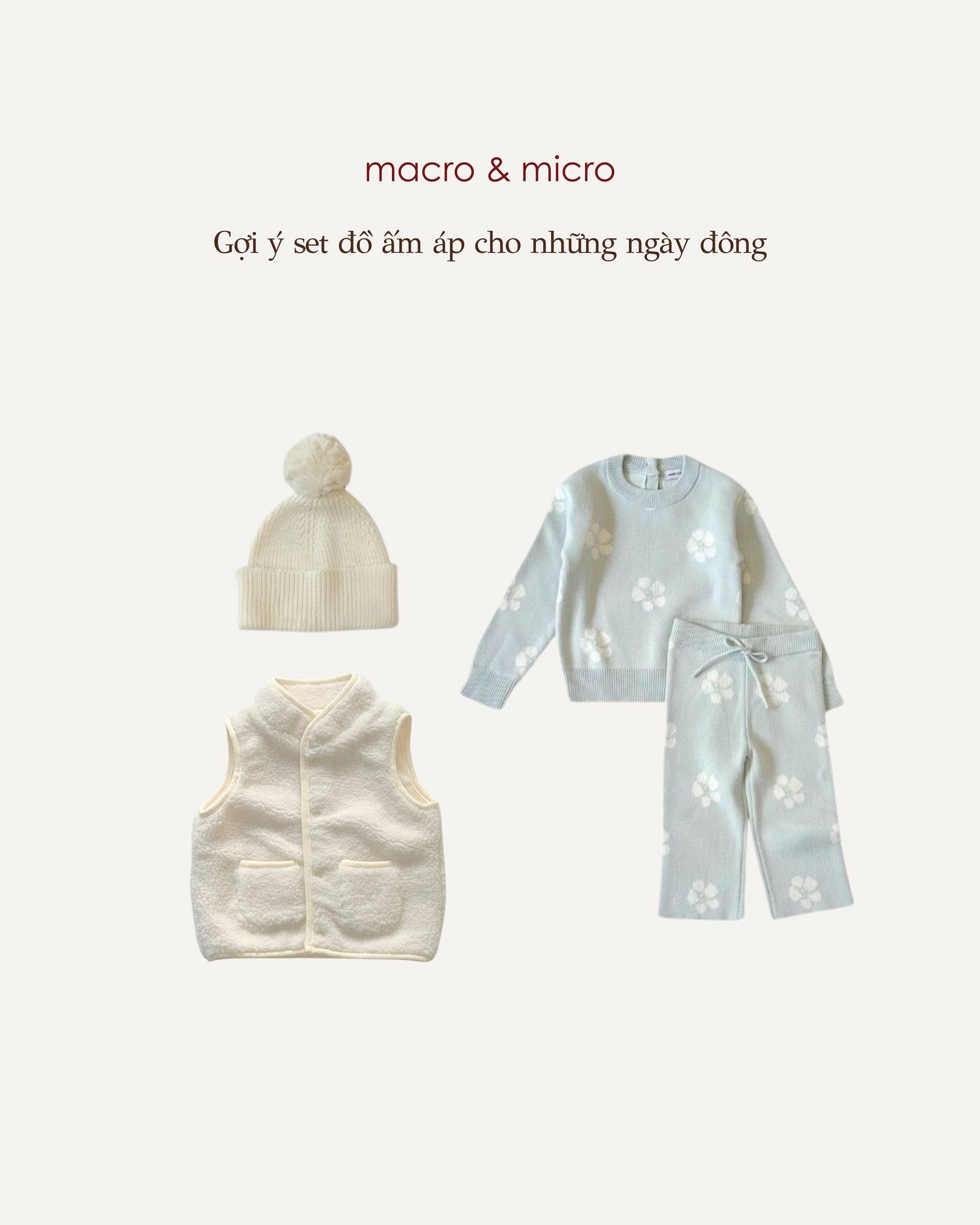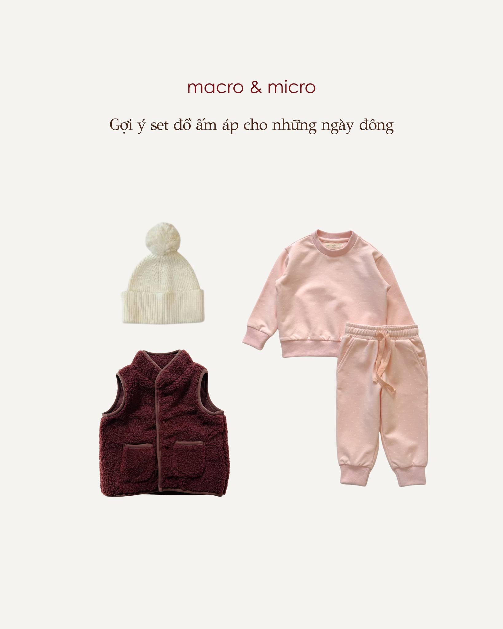 Macro & micro gợi ý mẹ chọn các thiết kế có chất vải dày dặn, mềm mại, phối cùng những gam màu ngọt ngào để giữ nhiệt tốt mà vẫn gọn gàng, tinh tế. Từ áo len, áo khoác cho tới quần nỉ, chỉ cần khéo một chút là bé đã có một outfit mùa đông vừa ấm áp, vừa đáng yêu để cùng gia đình dạo chơi hay ở nhà tận hưởng những khoảnh khắc thật yên.