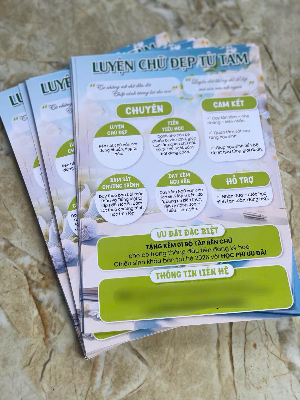 Thiết kế gọn gàng, dễ đọc, màu sắc nhẹ nhàng – phù hợp phát tay, tuyển sinh, khai giảng lớp học.