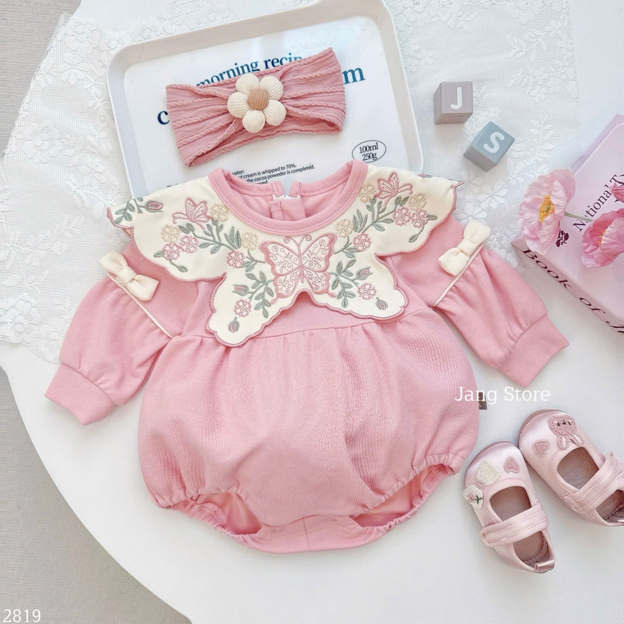 🦋 Thiết kế cổ yếm mềm mại, thêu hoa bướm nổi tinh tế – body nỉ hồng vừa ấm vừa yêu, tiểu thư cực xinh