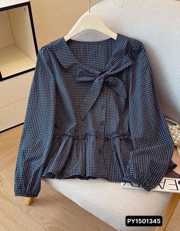 💙Áo sơ mi họa tiết kẻ caro xanh trắng trẻ trung với điểm nhấn nơ thắt lệch vai xinh xắn. ...