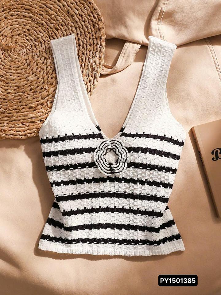 🤍Áo hai dây dệt kim phối sọc đen trắng thời thượng điểm xuyết bông hoa nổi bật ở ngực. ...