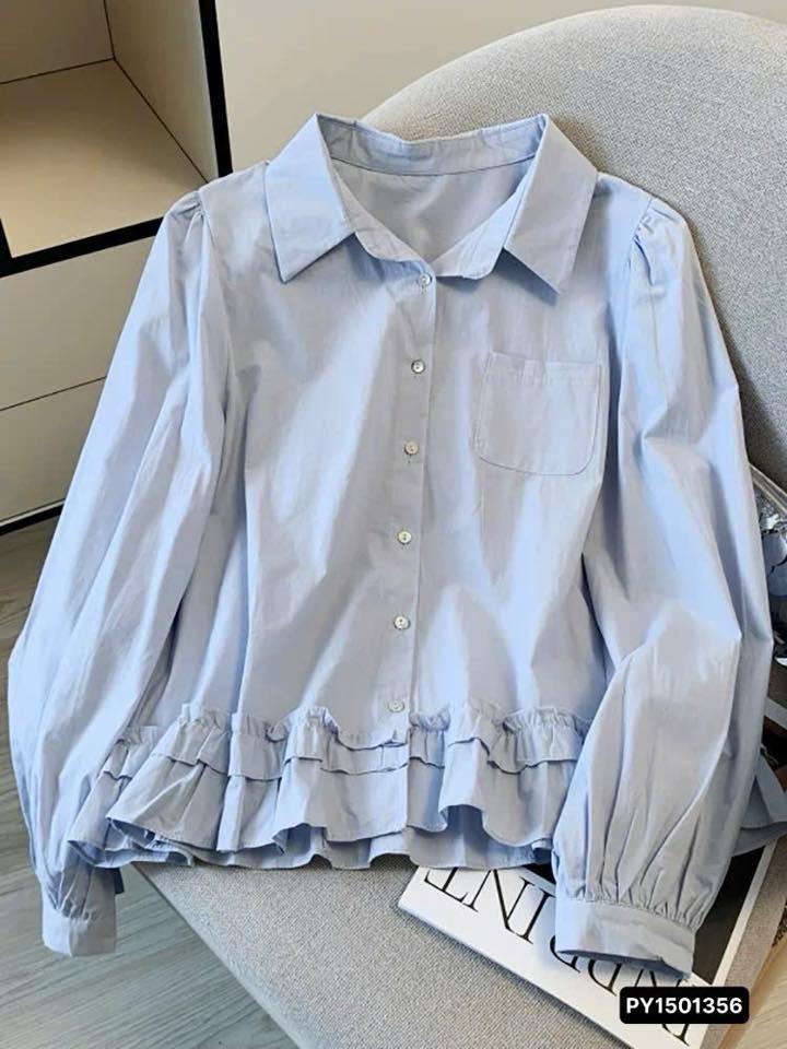 🩵Chiếc áo sơ mi xanh pastel dịu mát với thiết kế xếp ly lưng và bèo nhún gấu áo nhẹ ...