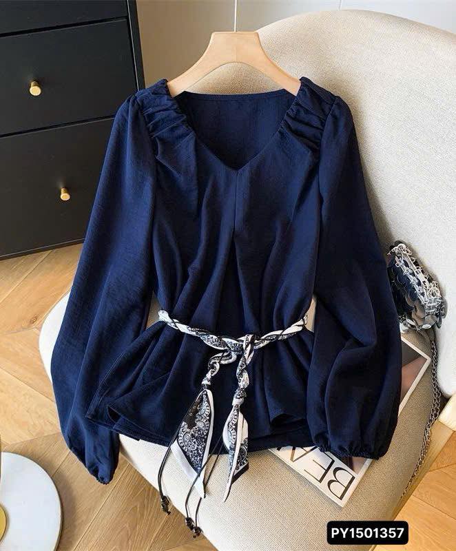 💙Áo kiểu tone xanh navy sang trọng nổi bật với điểm nhấn thắt nơ eo bằng khăn lụa họa ...