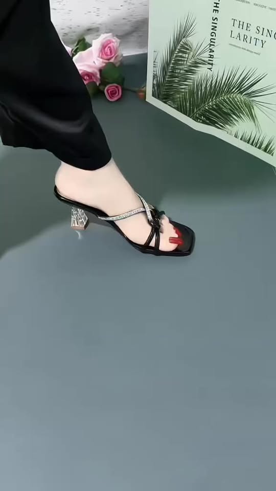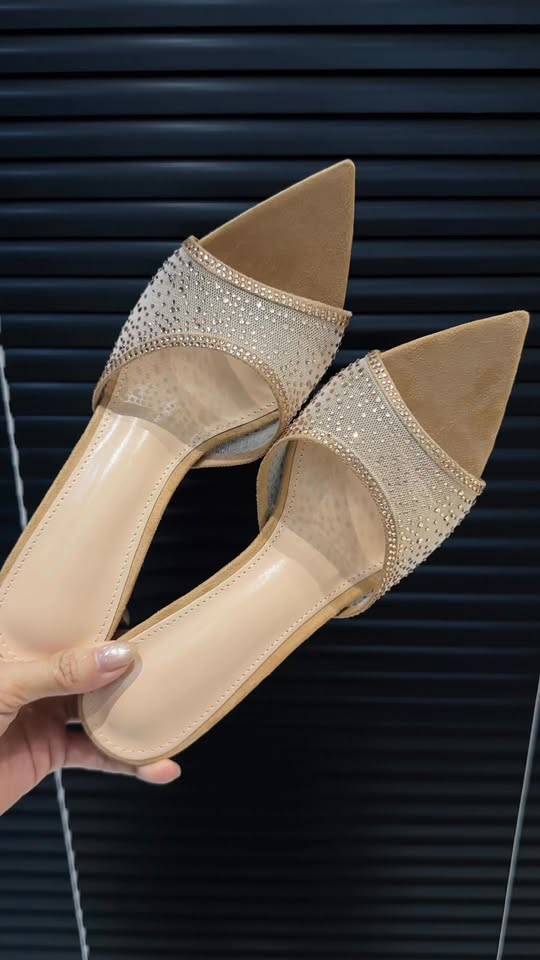 Dép mũi nhọn quai lưới mềm đính đá cao 8cm tôn da tôn dáng