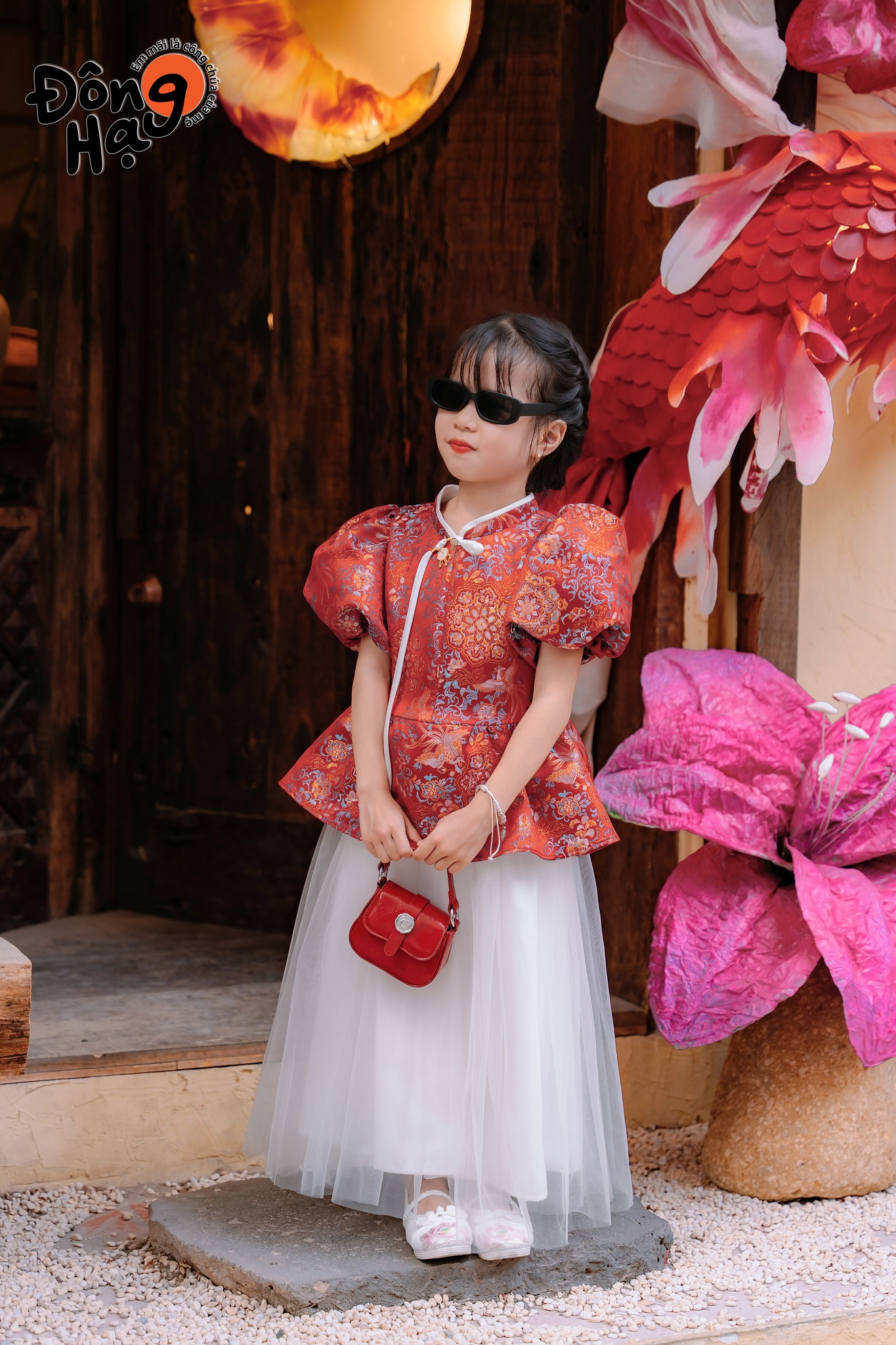 ✨ Áo Gấm Yên Vũ – Chất gấm đỏ ánh kim sang trọng, họa tiết dệt nổi tinh xảo giúp bé trông thật nổi ...