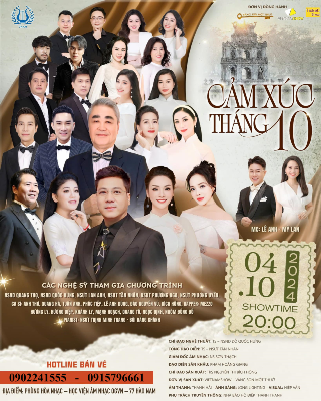 Bán vé đêm nhạc ” Cảm xúc tháng 10″ Ngày 04/10/2024 tại Học viện Âm nhạc Quốc gia Việt Nam – 77 Hào Nam – Hà Nội: NSND Quang Thọ, Tân Nhàn, Anh Thơ … Hotline: 0902241555 – 0915796661. Đặt vé trực tuyến: Ticketshow.vn.